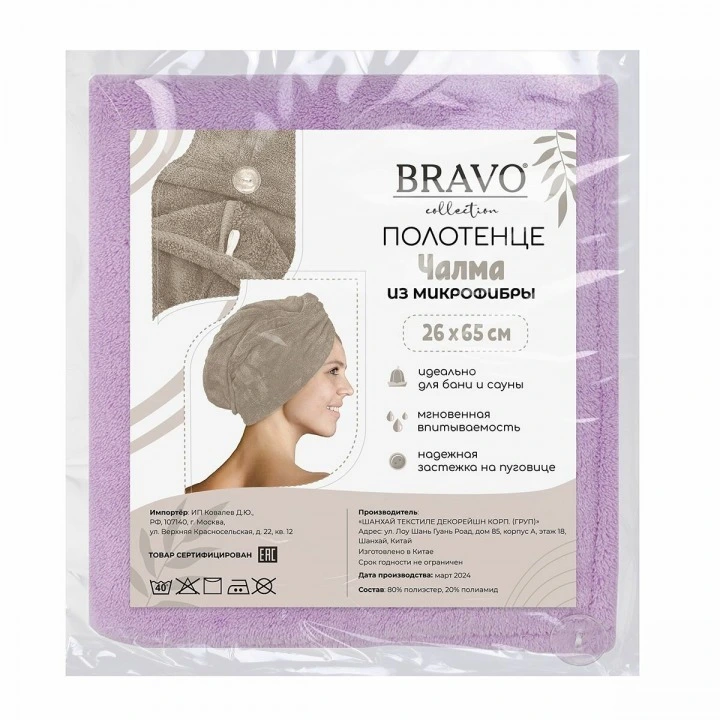 Полотенце-чалма для волос бренда BRAVO — идеальное решение для быстрой и бережной сушки волос. Мягкая микрофибра быстро впитывает влагу, сокращая время дальнейшей естественной сушки волос или сушки с использованием фена, что снижает риск повреждения волос. Уникальный дизайн в виде чалмы обеспечивает надёжную фиксацию, не спадает и позволяет свободно заниматься делами во время ухода за собой. Стильное, лёгкое и удобное полотенце подойдёт для ежедневного использования дома, в спортзале или поездках. Полотенце-чалма станет вашим незаменимым помощником в уходе за волосами, обеспечивая комфорт, аккуратность и красоту.