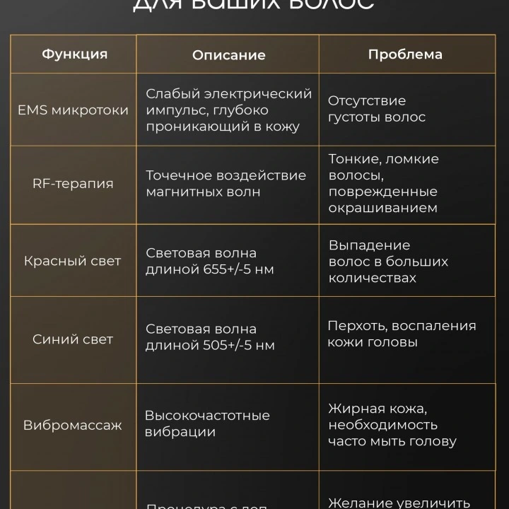 #повседневный уход #Трихологические процедуры #Очаговая алопеция #Псориаз #Себорея #Перхоть #Лечение волос в домашних условиях #Андрогенетическая алопеция (АГА) #Диффузная алопеция (телогеновая) #Тракционная алопеция #Алопеция при менопаузе #КоронавирусДлина волны (красный свет) | 655 нм |