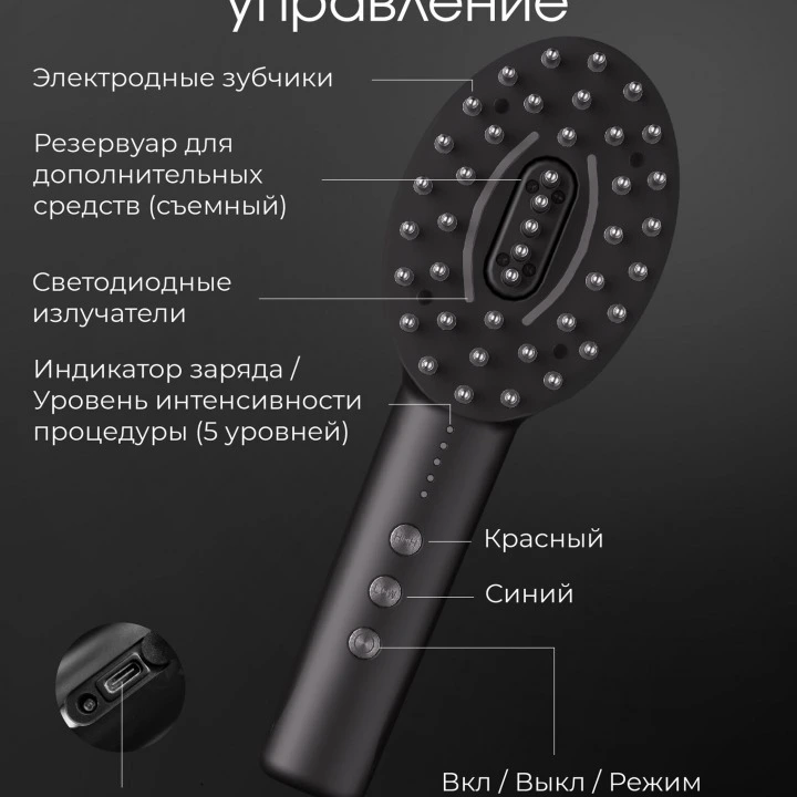 - Возможность заправки резервуара расчески сывороткой, лосьоном или тоником (общий объем 20 мл) для усиления эффекта роста волос.