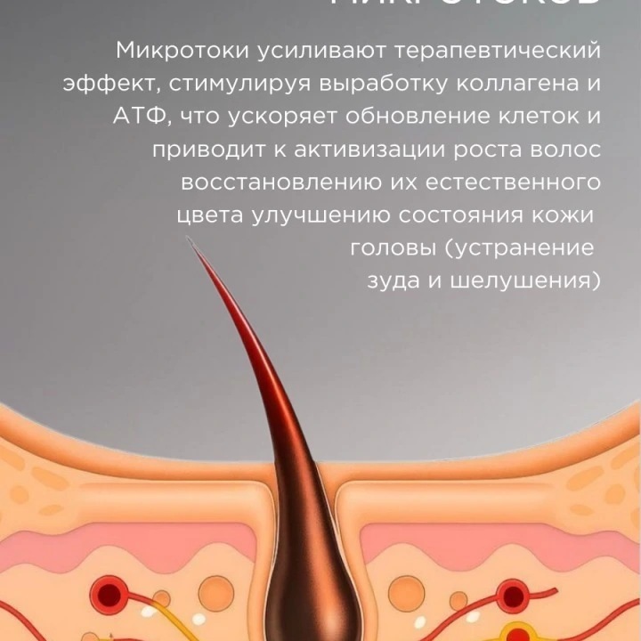 - EMS-микротоки стимулируют электрическими импульсами дермальные клетки и кровеносные сосуды кожи головы, улучшая микроциркуляцию и питание волосяных фолликулов. Это усиливает обменные процессы и способствует укреплению луковиц, предотвращая выпадение и ускоряя отрастание новых волос. Повышается густота волос.