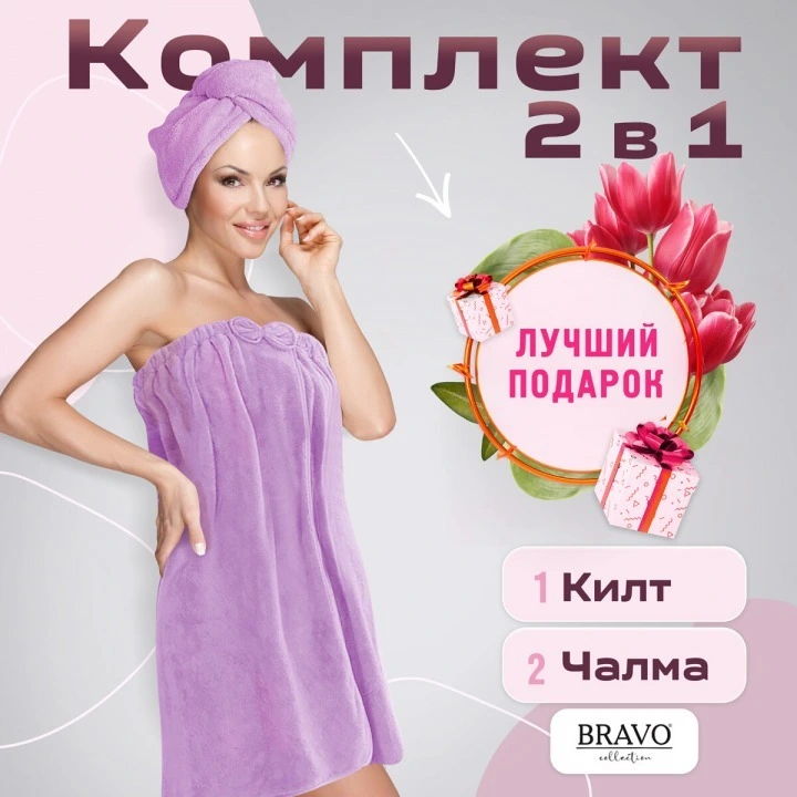 Набор из 2-х полотенец: килт с чалмой для волос бренда BRAVO - это комфорт и уют в вашей ванной комнате. Полотенца изготовлены из мягкой микрофибры, которая быстро сохнет, не впитывает запахи и легко стирается, что делает комплект незаменимым в банных условиях. Фактура ткани - велюровая, придает полотенцам мягкость и нежность. Отличный выбор для домашнего использования, посещения бани, сауны, а также в качестве подарка.