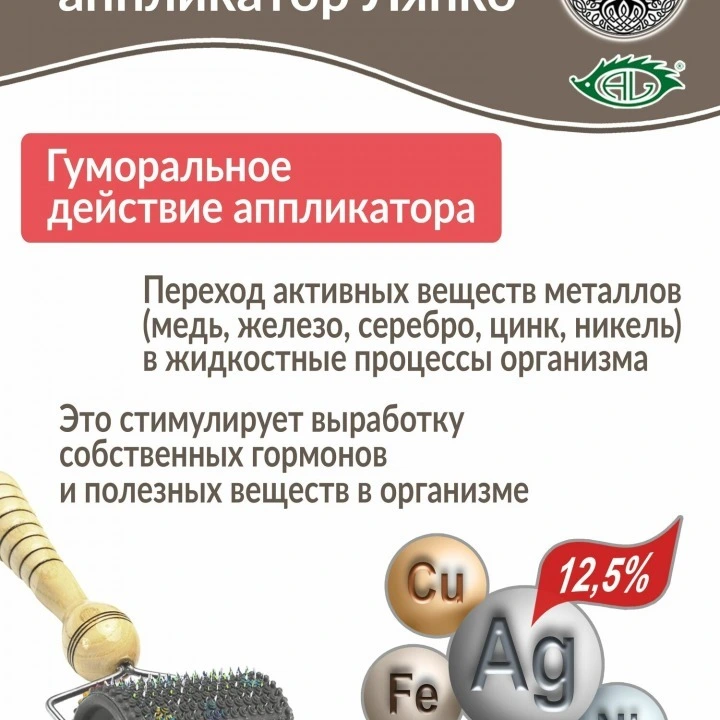 Валик Ляпко оснащён множеством мелких иголочек из различных металлов (медь, железо, цинк, никель, серебро), которые при контакте с кожей оказывают микромассаж и мягкое раздражающее действие. Это улучшает микроциркуляцию, усиливает приток крови и активизирует обменные процессы в коже головы. Волосы получают все необходимые полезные вещества (кислород, минералы, витамины, белки) только с кровью!