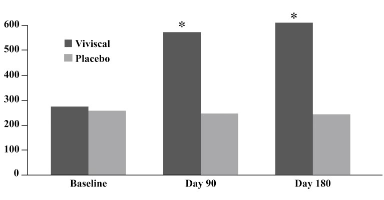 Рисунок - Увеличение количества терминальных волос ДО, через 90 и 180 дней лечения добавкой Viviscal у женщин.