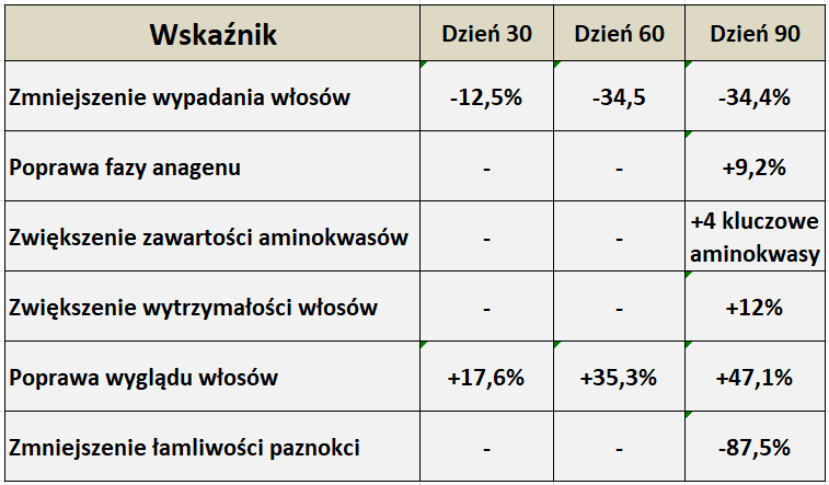 U osób przyjmujących placebo nie zaobserwowano poprawy w zakresie proporcji aminokwasów: seryny, kwasu glutaminowego, cystyny i metioniny w strukturze włosów.