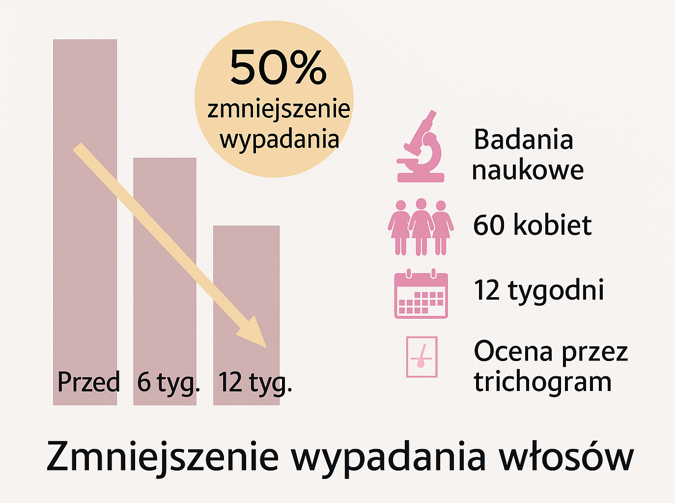 - Redukcja wypadania włosów o 50%, zmierzona za pomocą fototrichogramu, w porównaniu z grupą placebo (zob. rysunek).