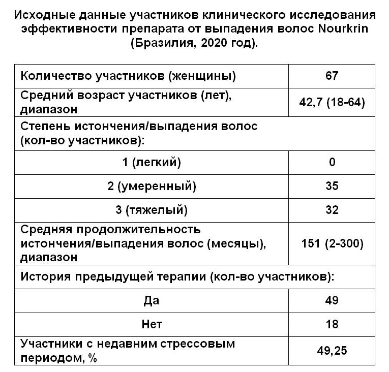 Участники: 67 женщин в возрасте от 18 до 64 лет (средний возраст 42,7 лет) с диффузным (телогеновым) выпадением волос, отобранные из разных дерматологических клиник в Бразилии. У женщин имелся разный стаж и тяжесть выпадения волос, которая оценивалась с использованием шкалы классификации Людвига для FPHL (потеря волос по женскому типу): умеренная (52%) или тяжелая (48%) степень диффузной потери волос.