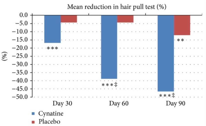 У участников группы плацебо не наблюдалось изменений ни в фазе анагена (роста), ни в фазе телогена (остановка роста) цикла роста волос через 90 дней. У участников, принимавших Cynatine, наблюдалось статистически значимое улучшение соотношения волос в фазах анаген/телоген.