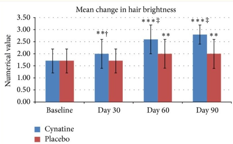 Результаты показали, что улучшение внешнего вида, блеска и яркости волос составило 47,1% через 90 дней приема Cynatine.