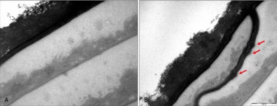 Рисунок 3 - Вздутие клеточно-мембранного комплекса у группы волос, высушенных естественным путём (В - стрелки указывают на вздутие межклеточных липидных слоёв), А - контроль.