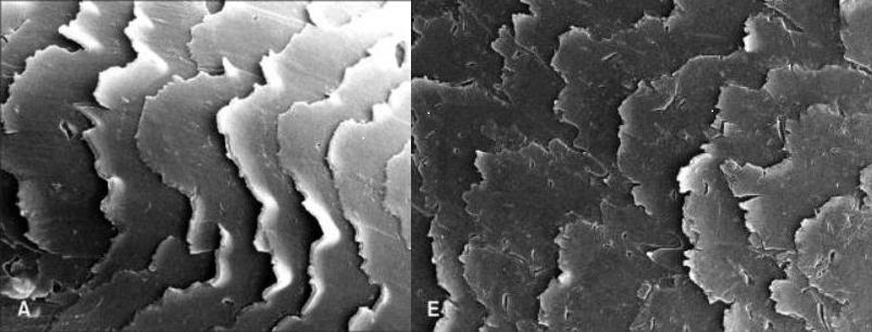Рисунок 1 - Повреждение поверхности волос при повышении температуры (А - контроль без обработки, Е - мытье шампунем и сушка феном в течение 15 секунд с расстояния 5 см (95°C).