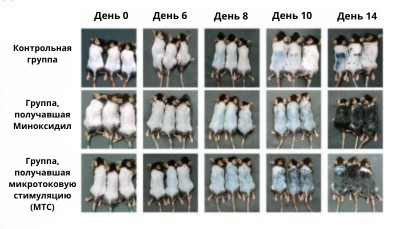 Фотографии выбритой кожи спины мышиных моделей были сделаны на 0, 6, 8, 10 и 14 день в контрольной группе, группе, получавшей Миноксидил, которая использовалась в качестве положительного контроля, и группе, получавшей микротоковую стимуляцию с интенсивностью 50 мкА (MТС).