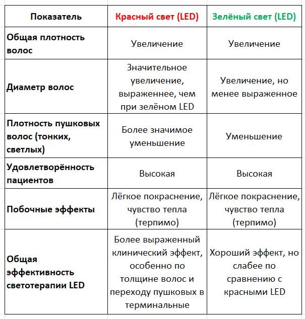 - Терапия красными светодиодами привела к статистически значимому уменьшению плотности пушковых волос и более значительному увеличению диаметра волос по сравнению с терапией зелеными светодиодами.